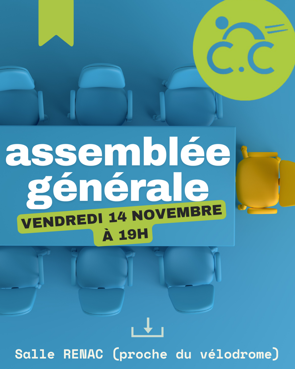 Veuillez noter que l'Assemblée Générale du CCC aura lieu le vendredi 14 novembre 2025 à partir de 19h00, salle Renac à Châteaubriant (à côté du vélodrome et du dojo).