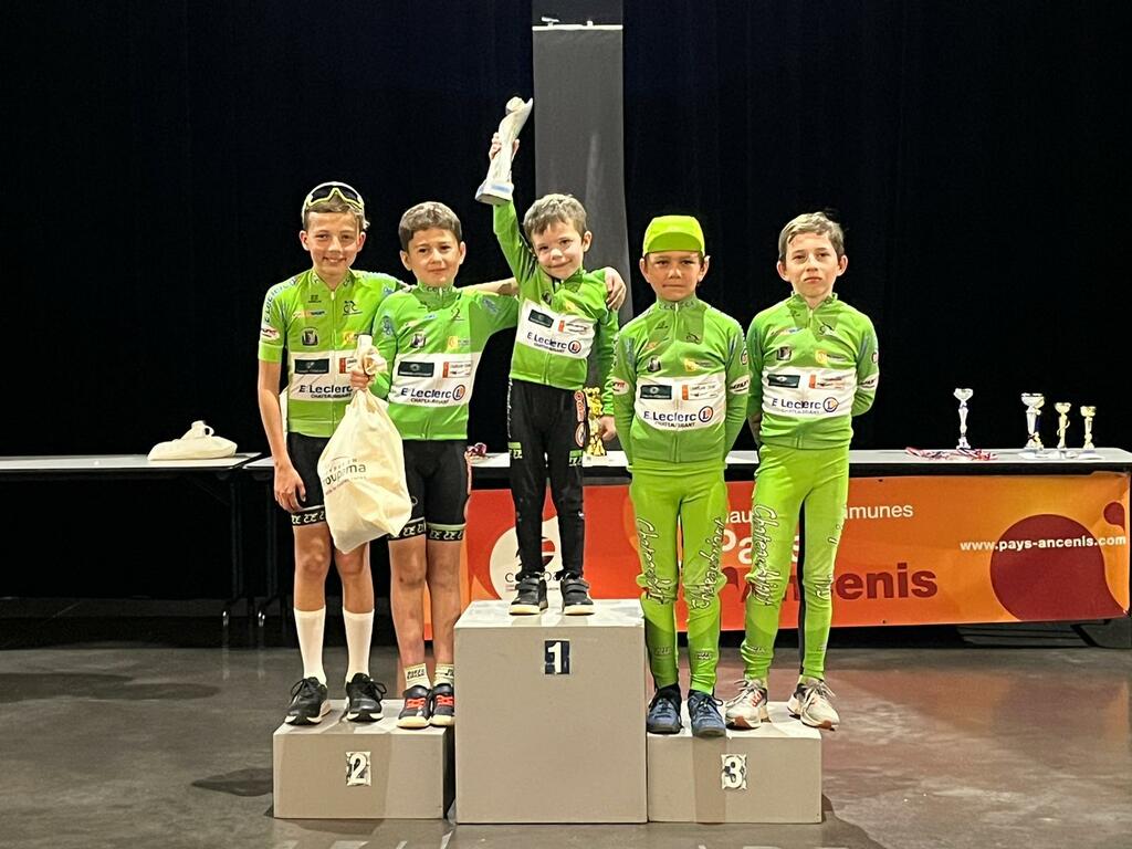 Le samedi 6 mai, à Mésanger, nos jeunes coureurs de l'école de vélo participaient à la rencontre organisée par le Pays d'Ancenis Cyclisme 44. Sur la journée complète, les épreuves de cyclo-cross, de jeux d'adresse, de vitesse et enfin de route étaient le terrain de jeux des enfants. Avec seulement 5 coureurs, un effectif minimal pour pouvoir prétendre entrer dans le petit cercle des "équipes complètes", le CCC parvient à décrocher un podium, un belle 3eme place! Autant dire que Nathan, Marceau, Tom, Baudouin et Elias ont été performants et combatifs...