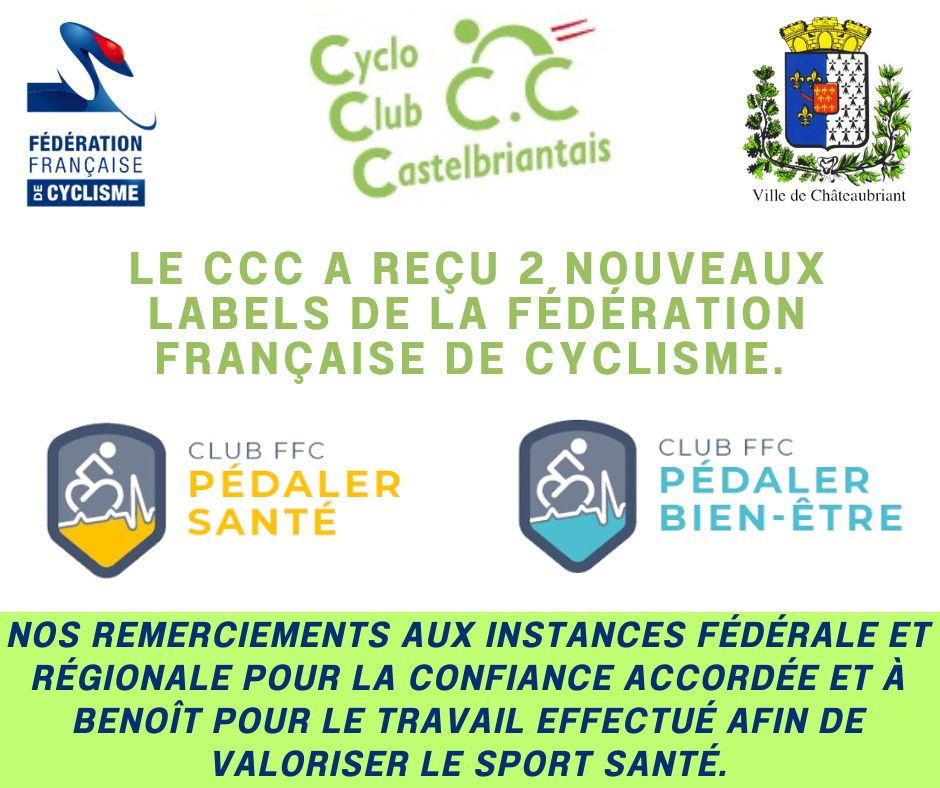 Le Cyclo-Club Castelbriantais s'est vu attribuer de la Fédération Française de Cyclisme deux autres labels : "pédaler santé" et "pédaler bien-être". Ces labels sont la reconnaissance de l'engagement de notre club pour le sport santé. Il se caractérise notamment (mais pas uniquement) par la mise en place du Vel' fit animé par Benoît que nous remercions très chaleureusement. Ils valorisent aussi l'engagement de tous dans le développement de nos activités et s'ajoutent aux deux autres labels déjà obtenus, "École française de cyclisme" et "team Piste formation".